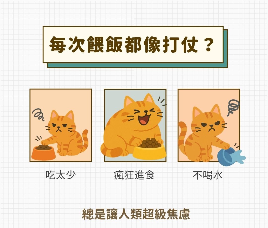 你家也有這些狀況嗎?吃太快、太慢、太少、太多、挑食、不喝水、半夜吵、換食失敗,每次餵飯都像在跟大魔王戰鬥。