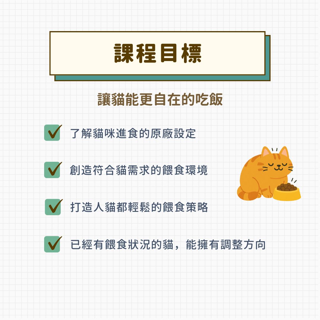 這堂課會從「行為面」出發,帶你拆解貓的飲食需求,從體態判斷、活動力、碗、位置、藏食玩具、喝水等等策略,一步步讓貓願意吃、吃得對、吃得安心。