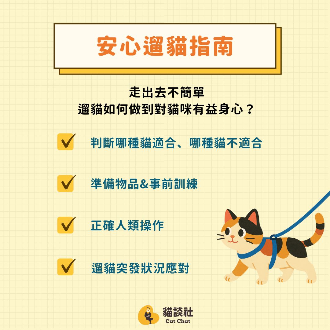 - 本課程強調尊重貓咪意願,不鼓勵任何強迫或高壓方式操作。外出與遛貓都必須依據個體差異、場地與裝備條件,循序漸進才安全。若操作不當,反而可能讓貓咪壓力爆棚、增加風險。