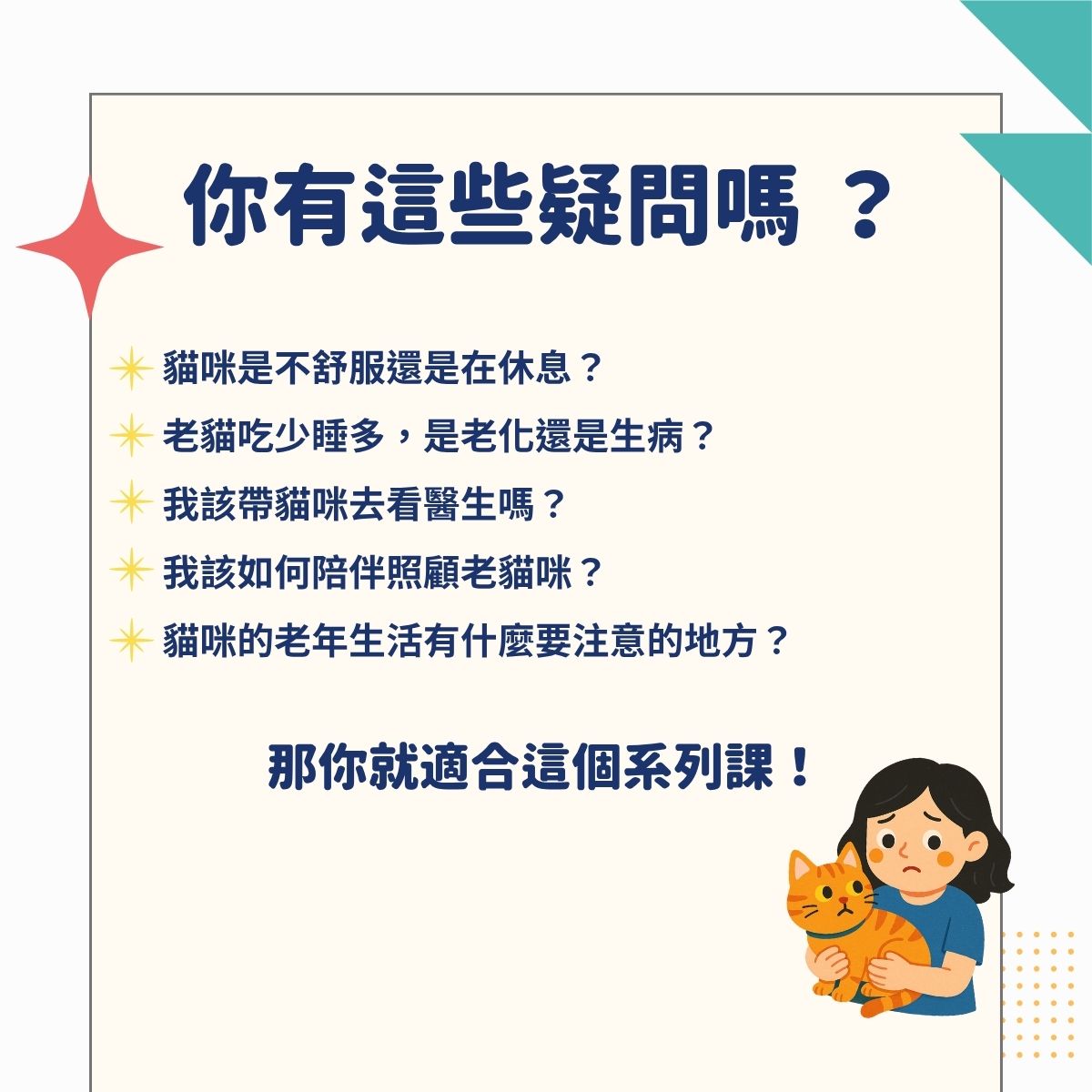 這堂課裡,將由洪巧凌獸醫會帶你認識老貓常見疾病、教你從日常觀察判斷是否該就醫。